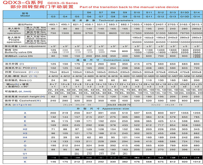QDX3-G系列 部分回轉型閥門手動裝置該產品是一種90°回轉驅動裝置,適用于球閥、蝶閥、旋塞閥等類型閥門。特殊型可輸出360°轉角。而且手輪方向朝上適用于管道閥門。